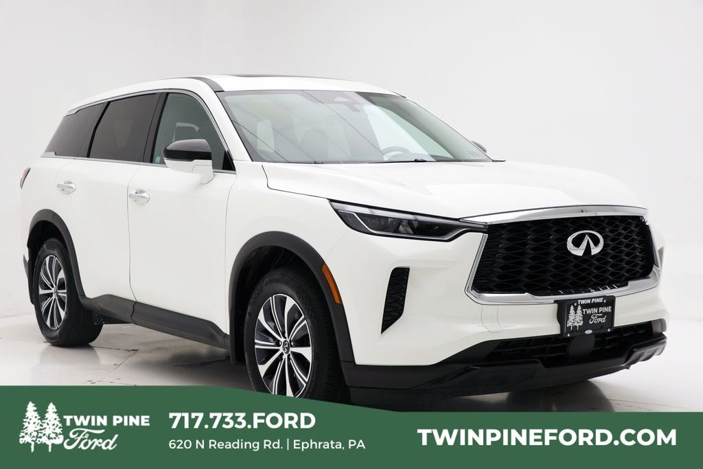 Twin Pine Ford has the Nicest Inventory at the Best Prices. 2025 INFINITI QX60 PURE Majestic White/Blk Obsid AWD
